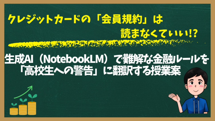 高校生の金融教育に使える授業案!クレジットカードの難解な「会員規約」を、Googleの生成AI「NotebookLM」を使って「高校生への警告」に翻訳する方法を紹介します。リボ払いや遅延損害金などのリスクを、生徒が自分事として理解できる実践的な授業の作り方です。