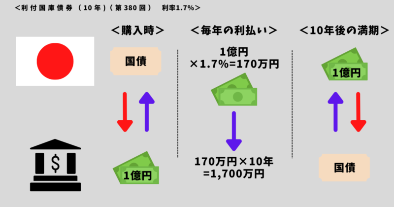 国債は「国にお金を貸す」のと同じなので、定期預金の利息のように、決められたタイミングで利子が支払われます。利子が支払われる回数(年1回・年2回など)や、満期までの期間(2年〜40年など)は国債の種類によって異なります。