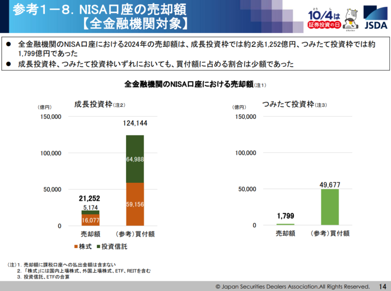 また、「買った後に売って日本円に戻しているのでは?」と思うかもしれませんが、2024年の売却額は、成長投資枠で約2.1兆円、つみたて投資枠ではわずか約1,800億円に留まっています 。 今のところ、お金は「海外へ出っ放し」の状態に近いと言えます。