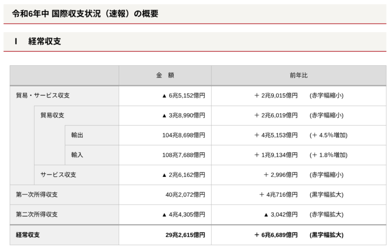 - 貿易赤字(モノの赤字): 約6.5兆円 エネルギー(石油・ガス)や食料の輸入などで、日本が支払ったお金の超過分です。(※参考:財務省 令和6年中 国際収支状況(速報)の概要)